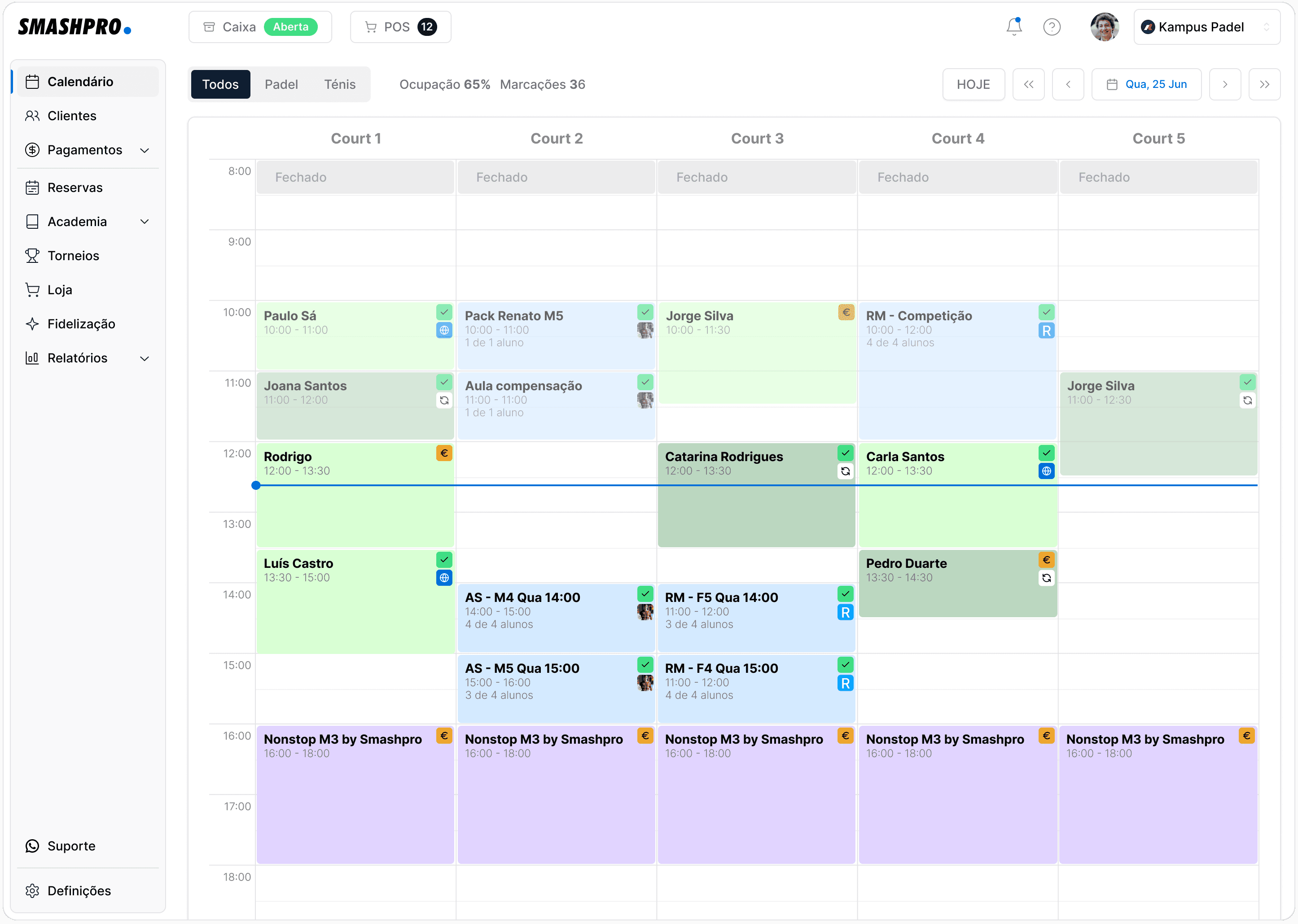 A gestão de aulas, turmas, packs e mensalidades torna-se confusa quando está separada das reservas e dos clientes.